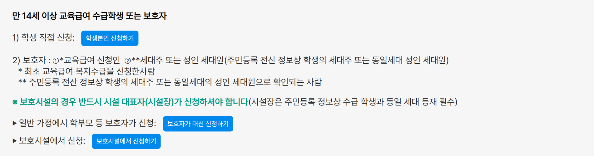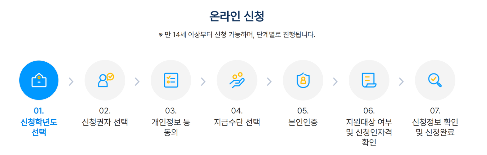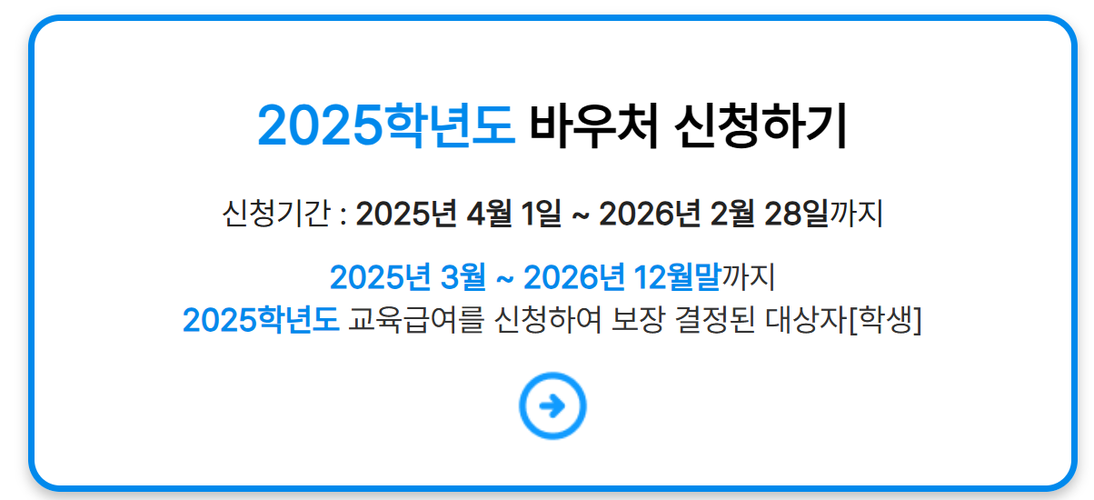 교육급여 바우처는 만 14세 이상의 교육급여 수급 학생 본인 또는 보호자, 세대주 또는 성인 세대원이 신청할 수 있습니다. 기존 수급자는 자격 유지 시 자동 신청 처리되며, 신규 수급자는 2025년 4월 1일부터 신청이 가능합니다.