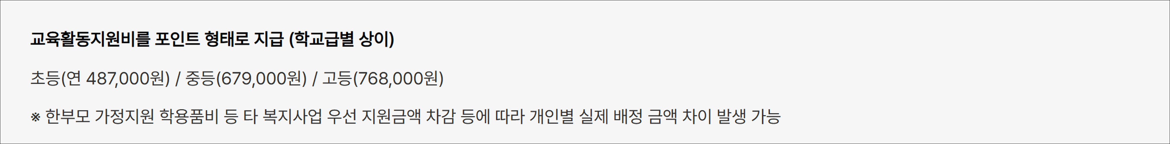 해당 금액은 연 1회 지급되며, 학습에 필요한 물품 구입 등 교육 목적의 항목에 한해 사용할 수 있습니다.