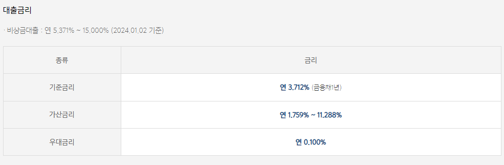 2024년 1월 2일 기준, 카카오뱅크 비상금대출의 금리는 다음과 같습니다.